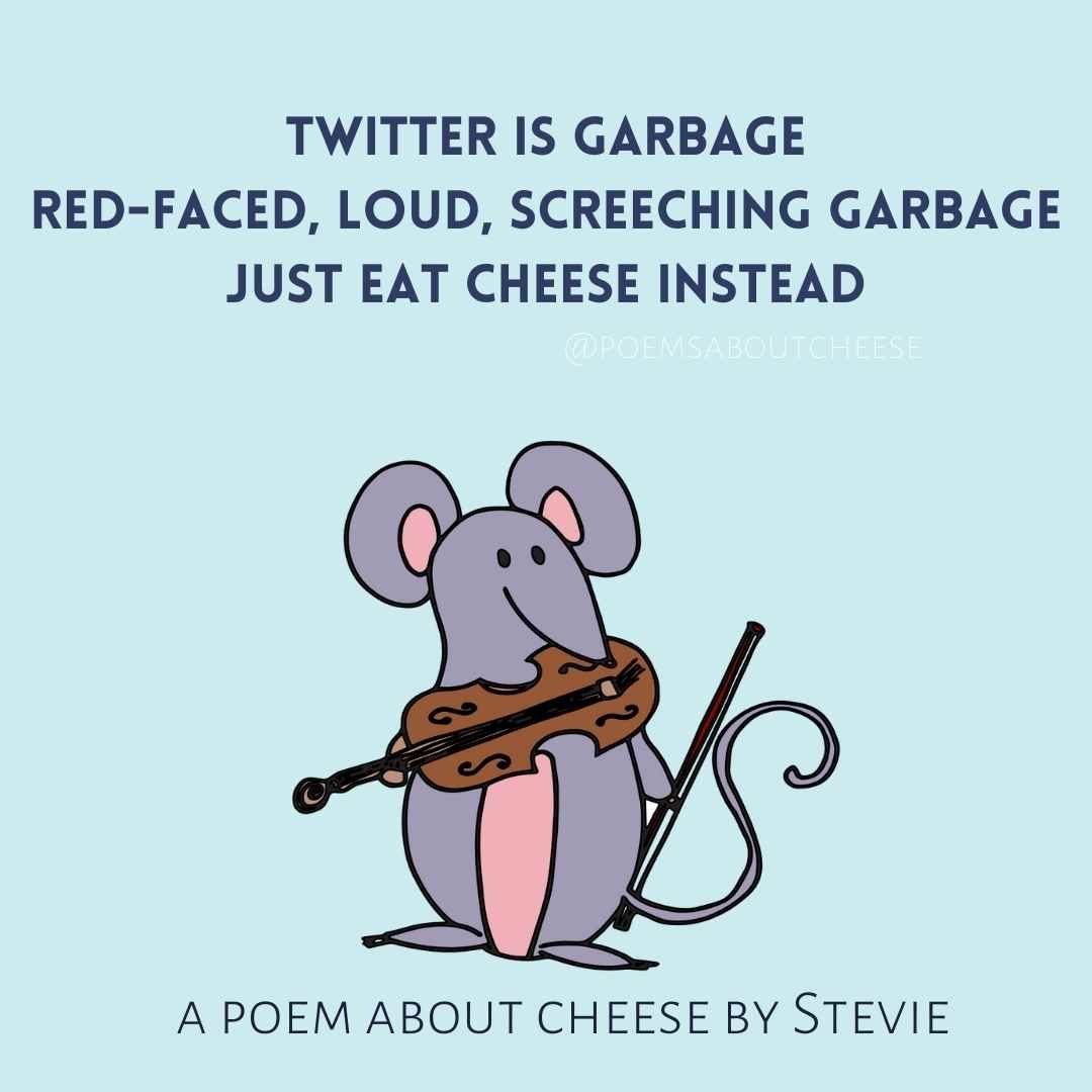 Twitter i Garbage HAIKU March 27, 2022August 7, 2022 Twitter is garbageRed-faced, loud, screeching garbageJust eat cheese instead Share this: Click to share on X (Opens in new window) X Click to share on Facebook (Opens in new window) Facebook Like Loading... Related