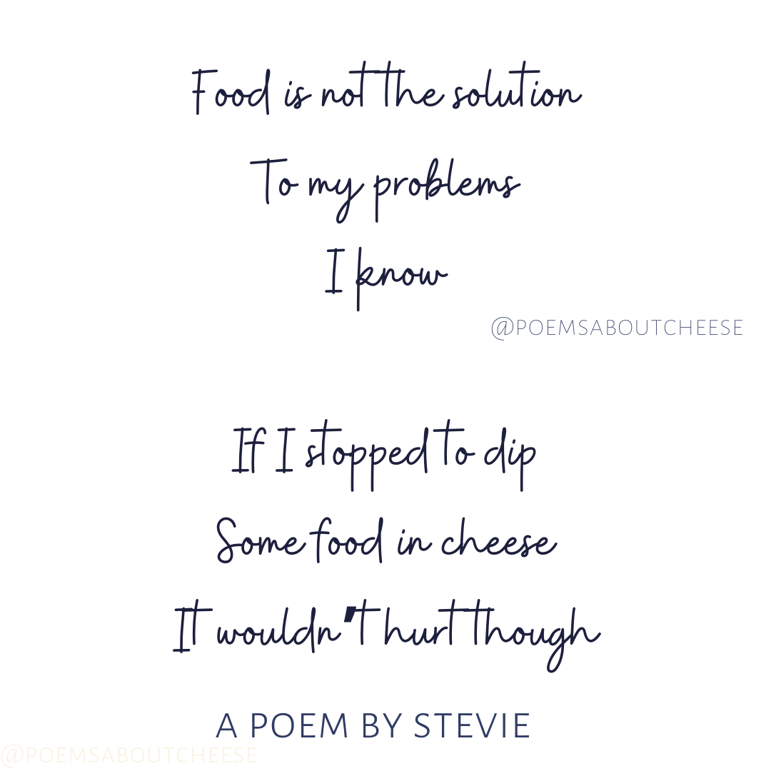 Dip Some Food In Cheese April 7, 2022August 8, 2022 Food is not the solutionTo my problemsI knowIf I stopped to dipSome food in cheeseIt wouldn’t hurt though Share this: Click to share on X (Opens in new window) X Click to share on Facebook (Opens in new window) Facebook Like Loading... Related