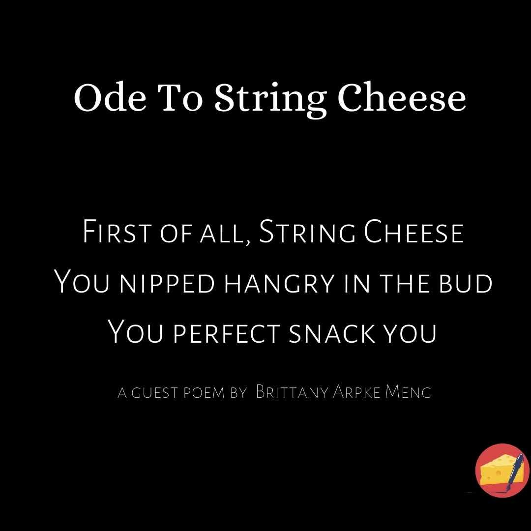 Ode To String Cheese April 19, 2022August 8, 2022 A guest poem by Brittany Arpke Meng First of all, String CheeseYou nipped hangry in the budYou perfect snack you Share this: Click to share on X (Opens in new window) X Click to share on Facebook (Opens in new window) Facebook Like Loading... Related