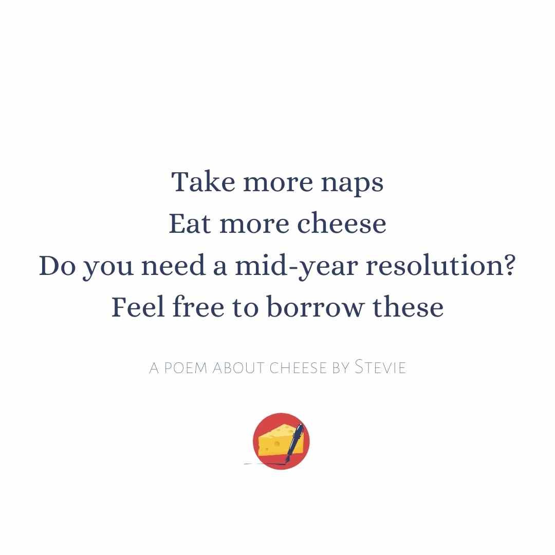 Mid-Year Resolution May 12, 2022August 9, 2022 Take more napsEat more cheeseDo you need a mid-year resolution?Feel free to borrow these Share this: Click to share on X (Opens in new window) X Click to share on Facebook (Opens in new window) Facebook Like Loading... Related